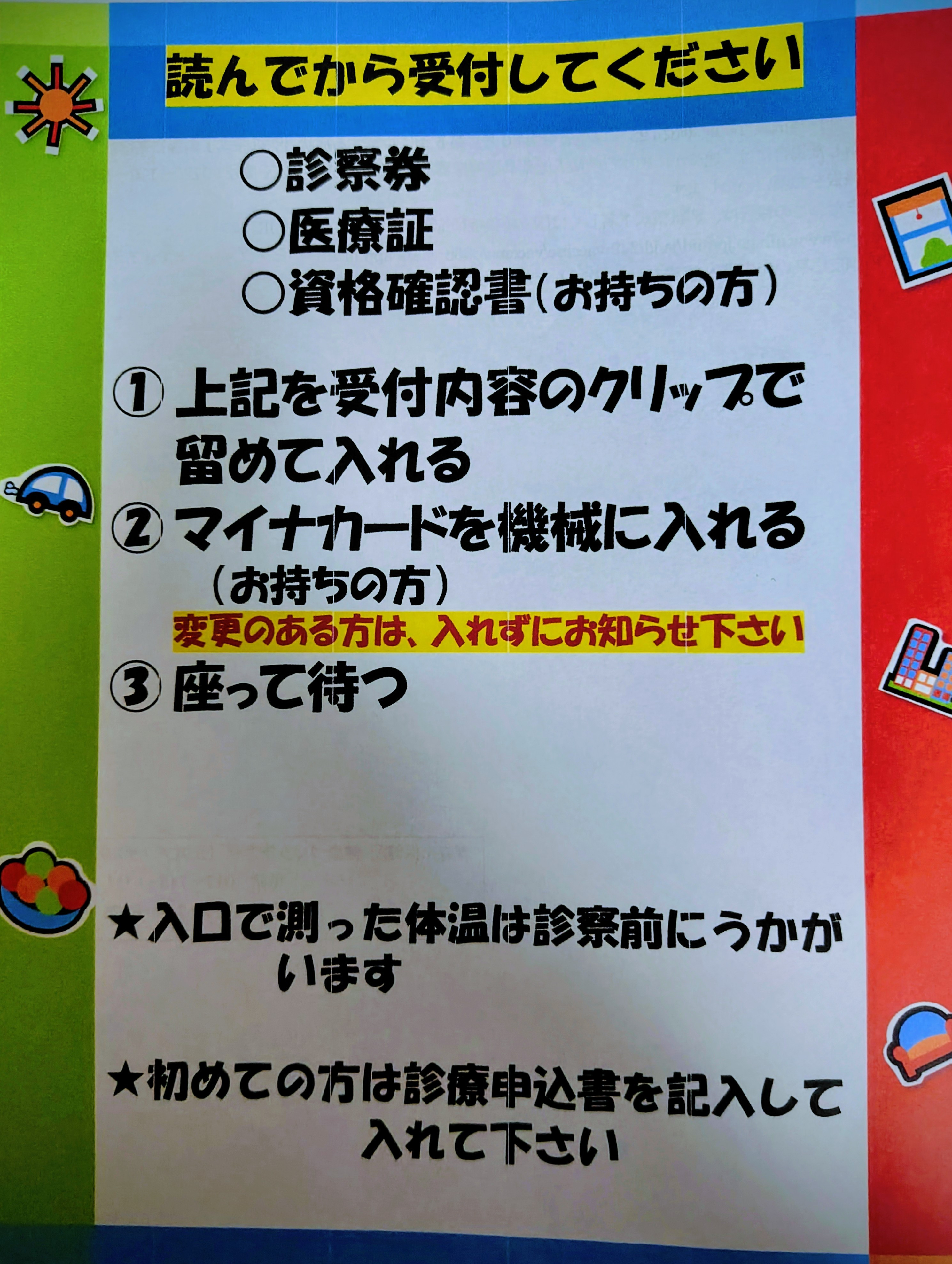 ※ 事前受付について(予約ではありません)午後の診療のみ午前に受付できます。上記受付同様【午後】のタグクリップをつけてBOXに入れた後マイナカードを機械に入れて下さい。午後来院時は玄関で検温し、受付に名前をお伝え下さい